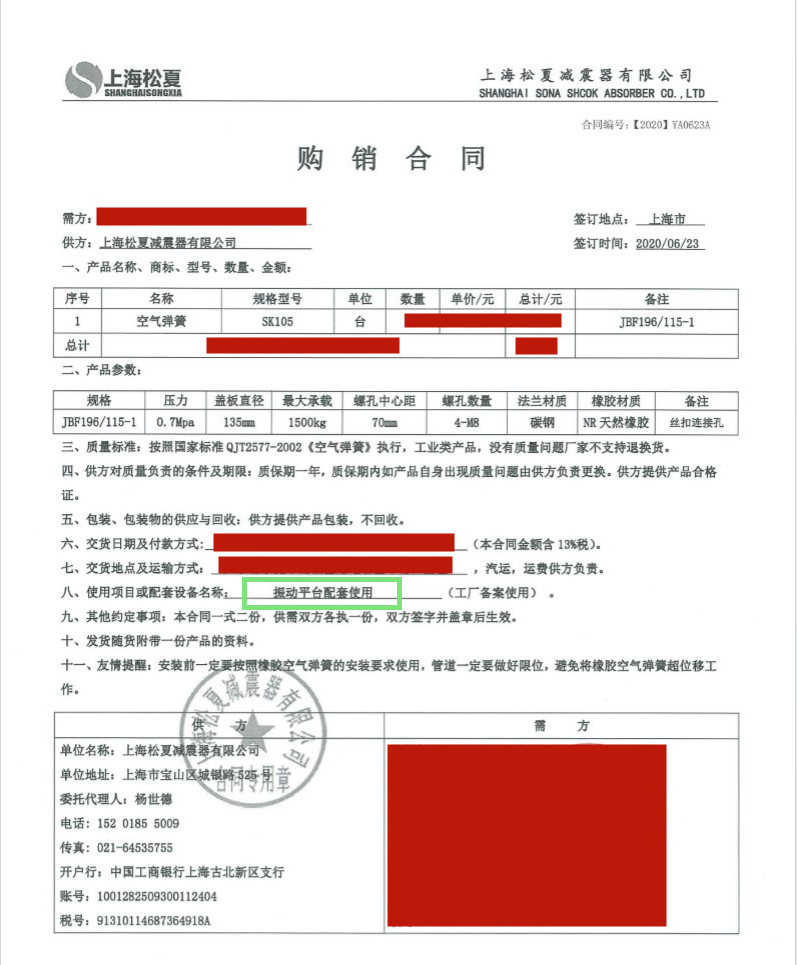 上海松夏減震器有限公司官方網站為您介紹:【震動平臺配套】使用上海松夏JBF196/115-1采購合同信息,我們松夏公司2020年為【震動平臺配套】使用上海松夏JBF196/115-1,起到了減震和降噪的作用,以下是【震動平臺配套】使用上海松夏JBF196/115-1采購合同介紹